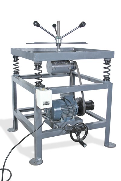 For compaction of concrete cube cylinders. The table deck size has stops along its edges to prevent moulds from walking off the table during operation. The frequency of vibration for the table operating at its maximum load capacity shall be between 3000 cycles per minute to 6000 cycles per minute. The height of the table top from the ground will not exceed 0.75 meter. The vibrator is mounted on cushioned steel vibrating deck. A switch is provided for starting the motor. Operation on 440 V, three phase, A.C. supply.